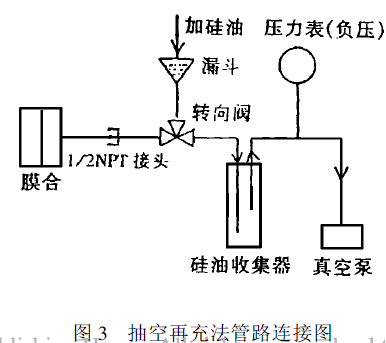 抽空后再充法是在常溫下, 將感應膜片和毛細管中的灌充液抽出并達到真空后, 再重新充入灌充液的方法。管路接法如圖3 。