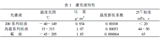 在實際使用中, 一般儀表技術人員都能注意小心使用, 很少出現(xiàn)上述故障。而法蘭式液位變送器的工作特性變成非線性的原因, 大多數(shù)是由于毛細管中的灌充液泄漏所致。一般情況下, 灌充液的密封是非常好的, 正確使用一臺此類變送器, 在3 ~ 6 年內(nèi), 泄漏量很小,線性還可以。如果使用時間更長的話, 由于微小泄漏的長期積累, 就會使灌充液過少,有時可以明顯看到感應膜片凹陷, 從而使變送器失去線性度而不可用。另一種情況是由于儀表技術人員未能注意工作溫度所致。下面我們先看一看常用的幾種灌充液的特性,如表1 。