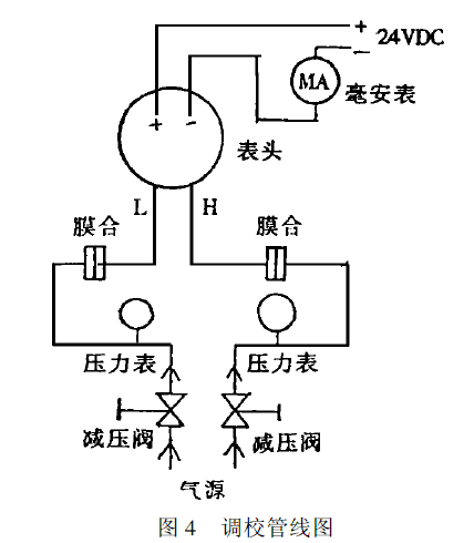 雙法蘭液位變送器(量程范圍為0 ~ 12.6kPa) 為例, 按以下步驟進行調(diào)校。按圖4 連接好氣路和線路。