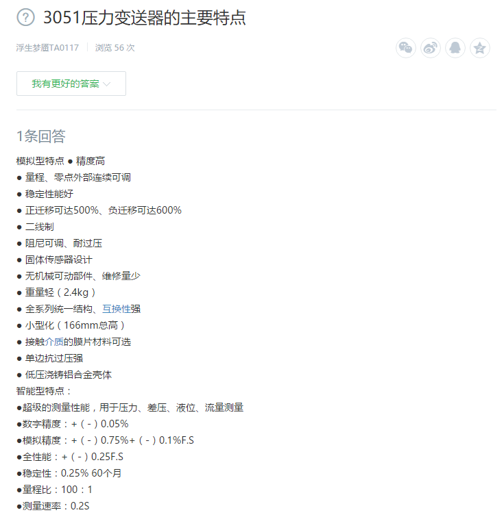 該款羅斯蒙特3051變送器具有高的性能,精度可達到精度0.075%,有差壓、表壓和絕壓型三種。