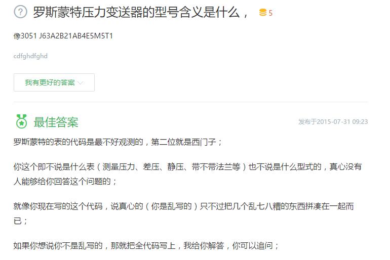 的表的代碼是最不好觀測的,第二位就是西門子;你這個即不說是什么表(測量壓力、差壓、靜壓、帶不帶法蘭等)也不說是什么型式的,真心沒有人能夠給你回答這個問題的;就像你現(xiàn)在寫的這個代碼,說真心的(你是亂寫的)只不過把幾個亂七八糟的東西拼湊在一起而已;如果你想說你不是亂寫的,那就把全代碼寫上,我給你解答,你可以追問;